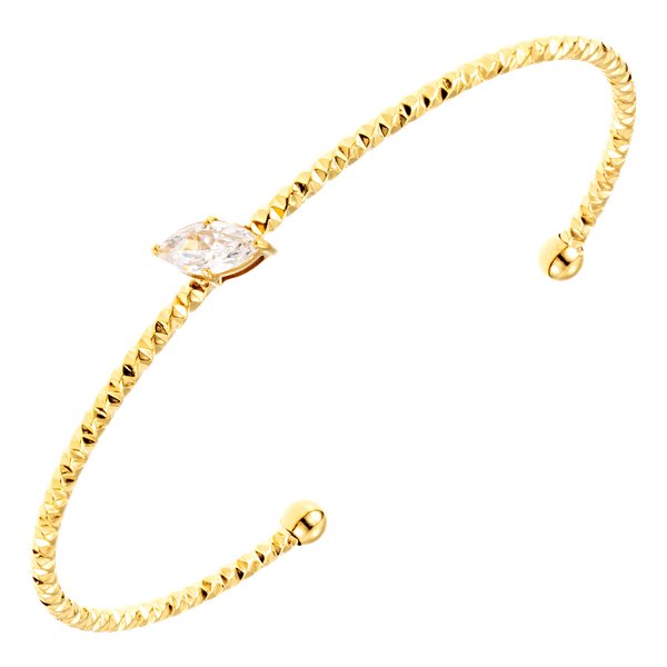 Tämä hento rannerengas on ajattoman eleganssin innoittama. Rengasta koristaa viehättävä markiisihiottu jalokivi, joka vangitsee valonsäteet liikkuessasi. Ranneke on ohut ja siro, ja siinä on aavistus tekstuuria, joka saa korun tuntumaan sekä modernilta että hienostuneelta. Avoin malli luo kevyen ilmeen ja tekee korusta helpon pukea ja stailata. Koru on valmistettu ruostumattomasta teräksestä. Korkealaatuinen 14 karaatin PVD-kultaus tekee siitä kestävän ja kauniin kiiltävän. Vedenkestävä ja nikkelitön. Leveys: 55 mm.