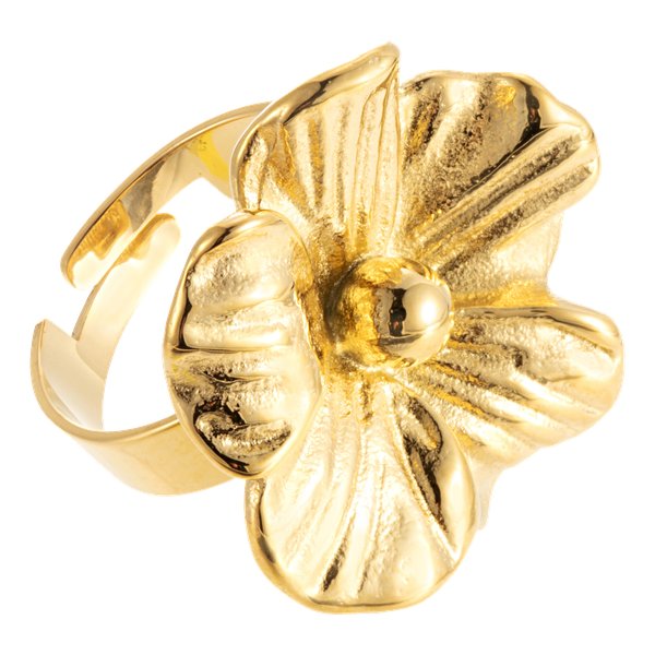 Kukan terälehtiä jäljittelevä design antaa korulle syvyyttä ja liikettä, kiiltävä keskiosa taas koristeellisuutta. Luonnollinen muoto luo itsevarman naisellisen ilmeen, joka viimeistelee upeasti minkä tahansa asukokonaisuuden. Valmistettu korkealaatuisesta ruostumattomasta teräksestä ja päällystetty 14 karaatin PVD-kultauksella. Koko: yhdenkoon – säädettävä leveys 22 mm.