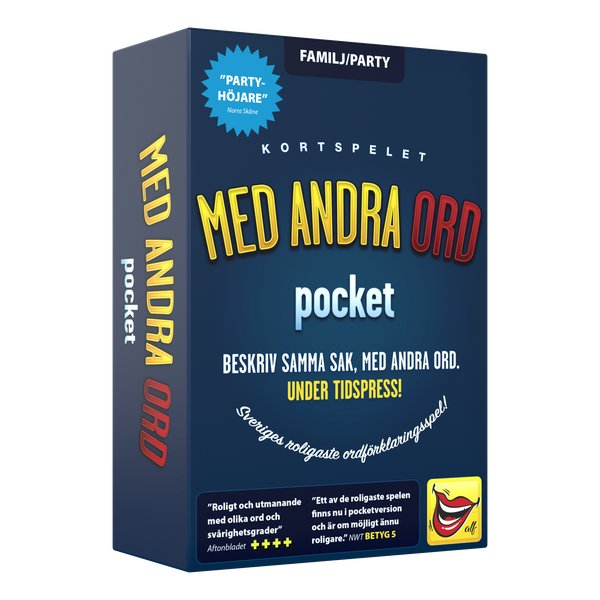Med andra ord pocket on mukaan otettava versio Ruotsin hauskimmasta sanaselityspelistä, jossa sanoilla on eri pistearvot. Uskallatko valita vaikean sanan, josta saa paljon pisteitä, vai pelaatko varman päälle valitsemalla helpon sanan ja tyytymällä pienempään pistemäärään? Suositusikä alk. 10 vuotta. Peliaika: n. 20 minuuttia 4–8 pelaajalle.