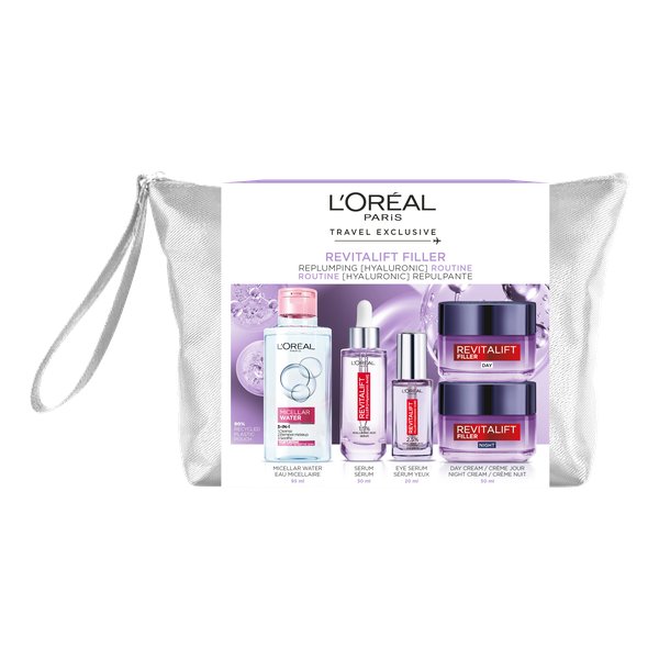 Hyaluronihappo on täyteläistävä superainesosa, joka voi sitoa jopa 1 000 kertaa painonsa verran vettä. Revitalift Filler [+ hyaluronihappo] -tuotesarjaan on nyt lisätty uusi ylellinen matkatuotepaketti, joka sisältää Filler-seerumin + silmänympärysseerumin + päivävoiteen + yövoiteen + miselliveden!