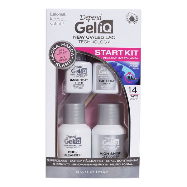 Uusi Gel iQ -geelilakka suurella iQ-geelipitoisuudella tuottaa superkiiltävän ja täyteläisen tuloksen, joka kestää jopa 14 päivää. NO PREP – ei viilausta tai vahvoja pohjustustuotteita; vain hellävarainen puhdistus ennen levitystä riittää valmisteluksi. Kovetetaan tuotteelle suunnitellulla UV/LED-lampulla 30 sekuntia/vaihe, jolloin saadaan itsestään tasoittuva lopputulos. Kuivuu välittömästi käsittelyn jälkeen. Aloituspakkaus sisältää kaiken tarvittavan paitsi värin ja poistoaineen. Sopii myös varpaankynsille.
