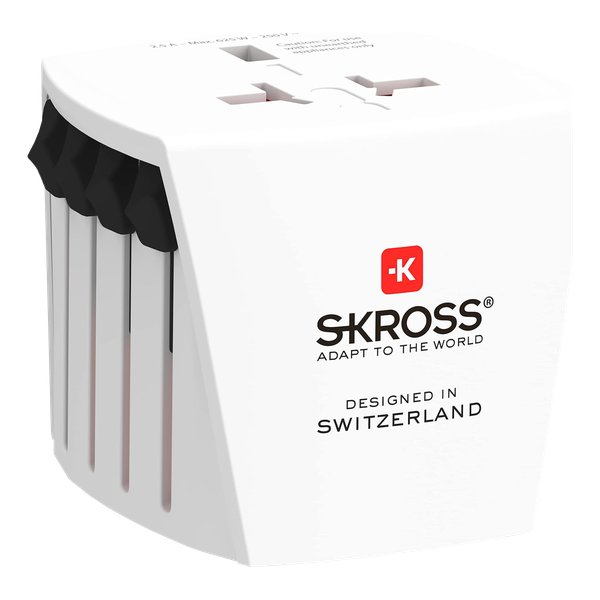 Rejseadapteren Skross World kan bruges til sikker og pålidelig opladning i over 150 lande. Det kompakte 2-polede design og patenteret justering med skydeknapper gør det nemt at tilslutte den. Adapteren lever op til internationale standarder og har børnesikring. Schweizisk mekanik er garanti for høj kvalitet. Specifikationer: 100–250 V AC, 2,5 A, udskiftelig sikring.