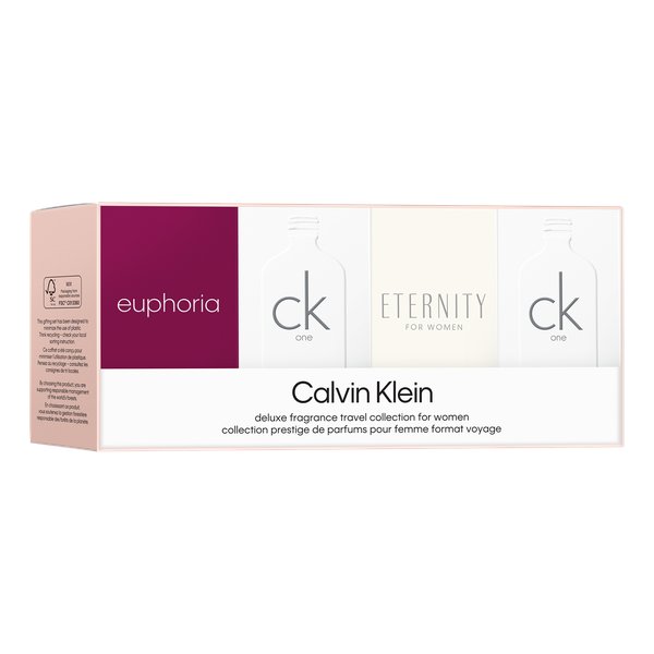 Et sæt med ikoniske Calvin Klein-dufte til damer. Dette CK parfumegavesæt indeholder: 2 × CK One Eau de Toilette 10 ml, Eternity Eau de Parfum for Women 5 ml, Euphoria Eau de Parfum for Women 4 ml.