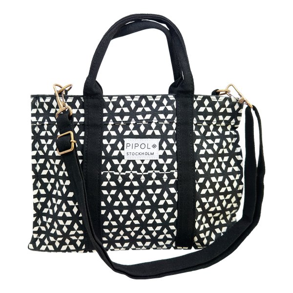 Smart, snygg och praktisk väska i slitstark bomullscanvas i ett läckert svart-vitt print. Väskan kan bäras cross-body, över axeln eller i handen och har en anpassningsbar rem som kan tas av. Väskan har en mindre ficka på insidan och stängs med dragkedja. Innerfodret är av nylon. Storlek: 30 × 22 × 10 cm.