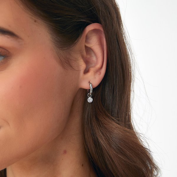 Detta örhänge inspirerat av modern elegans med diskret udd har en ring med en mjukt texturerad yta som reflekterar ljuset vackert ur alla vinklar. Ett nätt, rundslipat cubic zirkonia-hänge glittrar lite extra och skapar en perfekt balans mellan markerad struktur och feminin briljans. Det är tillverkat av rostfritt stål som ger en långvarig glans och står emot slitage utan problem. Vattentåligt och nickelfritt. Längd 20 mm.