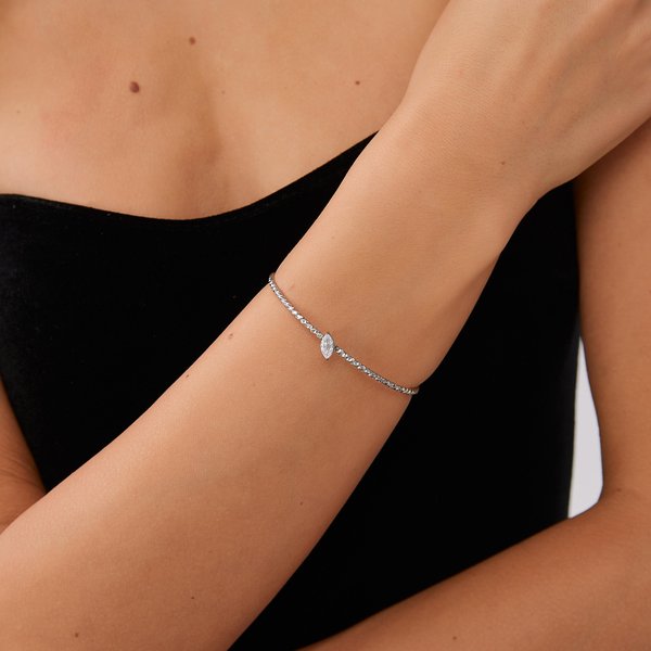 Det här skira armbandet är inspirerat av tidlös elegans och har en vackert navettslipad sten som fångar ljuset i varje rörelse. Det tunna, texturerade armbandet har en subtil dimension som skapar ett smycke som både känns modernt och har en sofistikerad elegans. Den öppna modellen ger ett lätt, graciöst intryck samtidigt som armbandet är enkelt att ta på sig och styla. Det är tillverkat av rostfritt stål som ger en hållbar finish och varaktig glans. Vattentåligt och nickelfritt. Vidd: 55 mm.